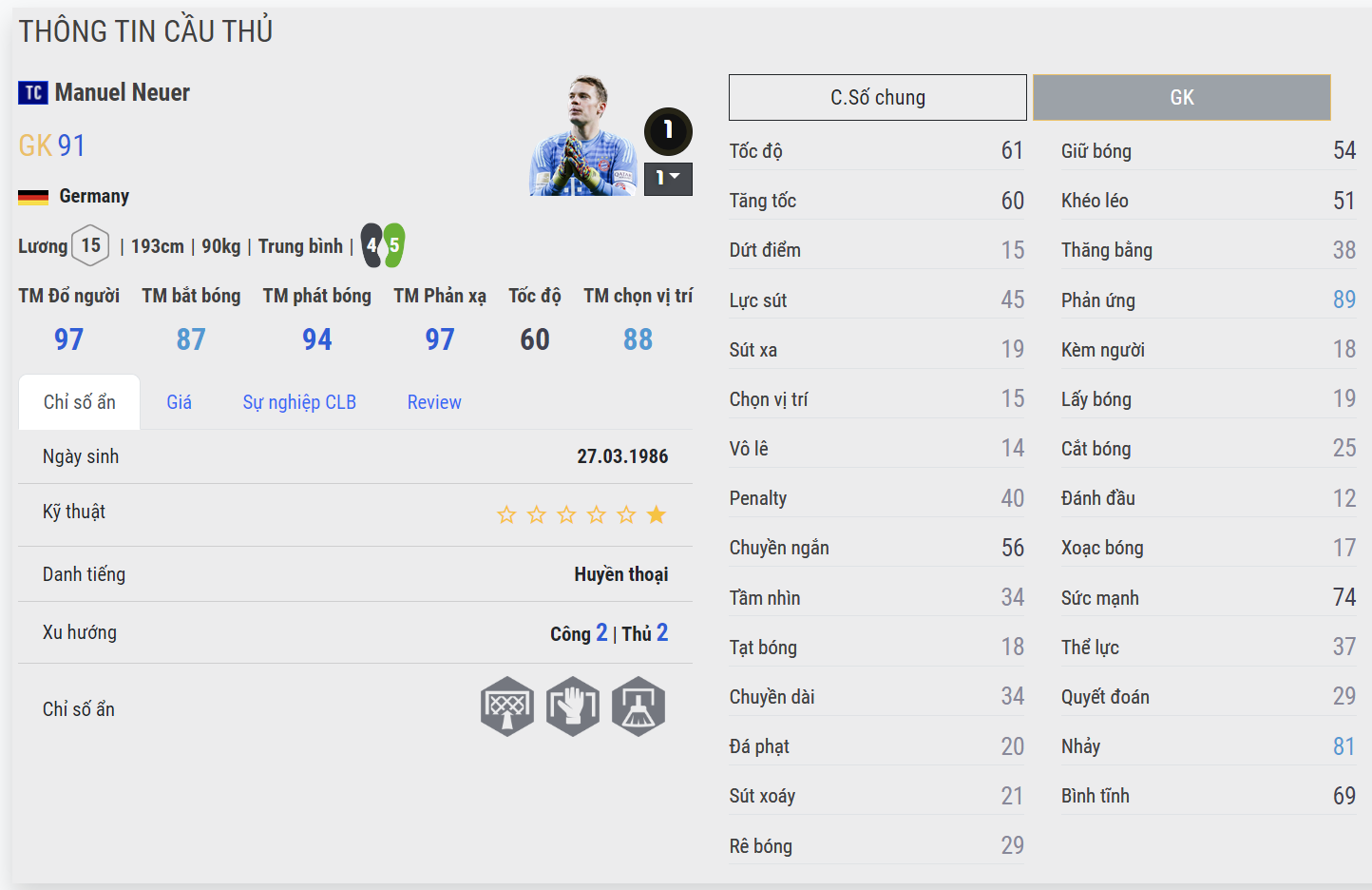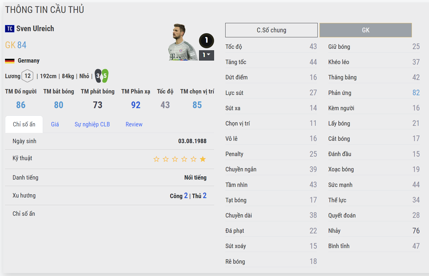 Cầu thủ thuộc biên chế Bayern tiếp tục là cái tên giành được sự quan tâm ở mùa giải TC. Mức lương 12 gần như rất rẻ so với giá trị sử dụng của anh khiến cho nhiều người chơi lựa chọn tin tưởng vào cầu thủ người Đức. Điểm mạnh của anh nằm ở khả năng phản xạ khá ảo cùng với khả năng đổ người tốt giúp hạn chế những cú sút góc thấp của đối thủ rất ổn.