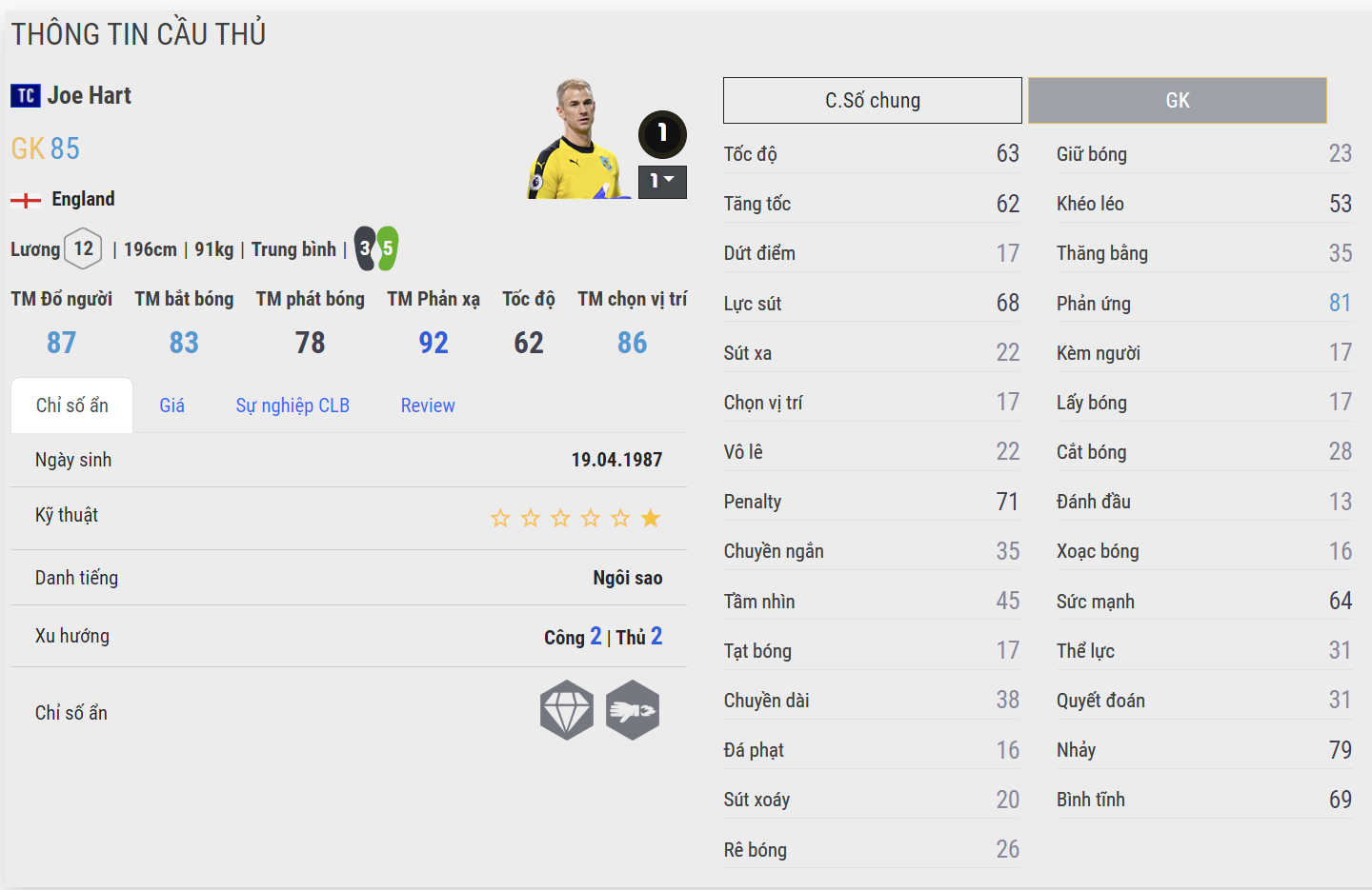 Đây được xem mà mùa thẻ ảo nhất của Joe Hart trong FC Online. Mùa TC Joe Hart bắt rất ảo, từ phản xạ, khả năng bay nhảy , đổ người cản phá đều cho thấy sự khó chịu đến bất ngờ. Không những thế, Joe Hart còn là vị trí cân lương tốt và đáng dùng cho team color Anh và Man City.