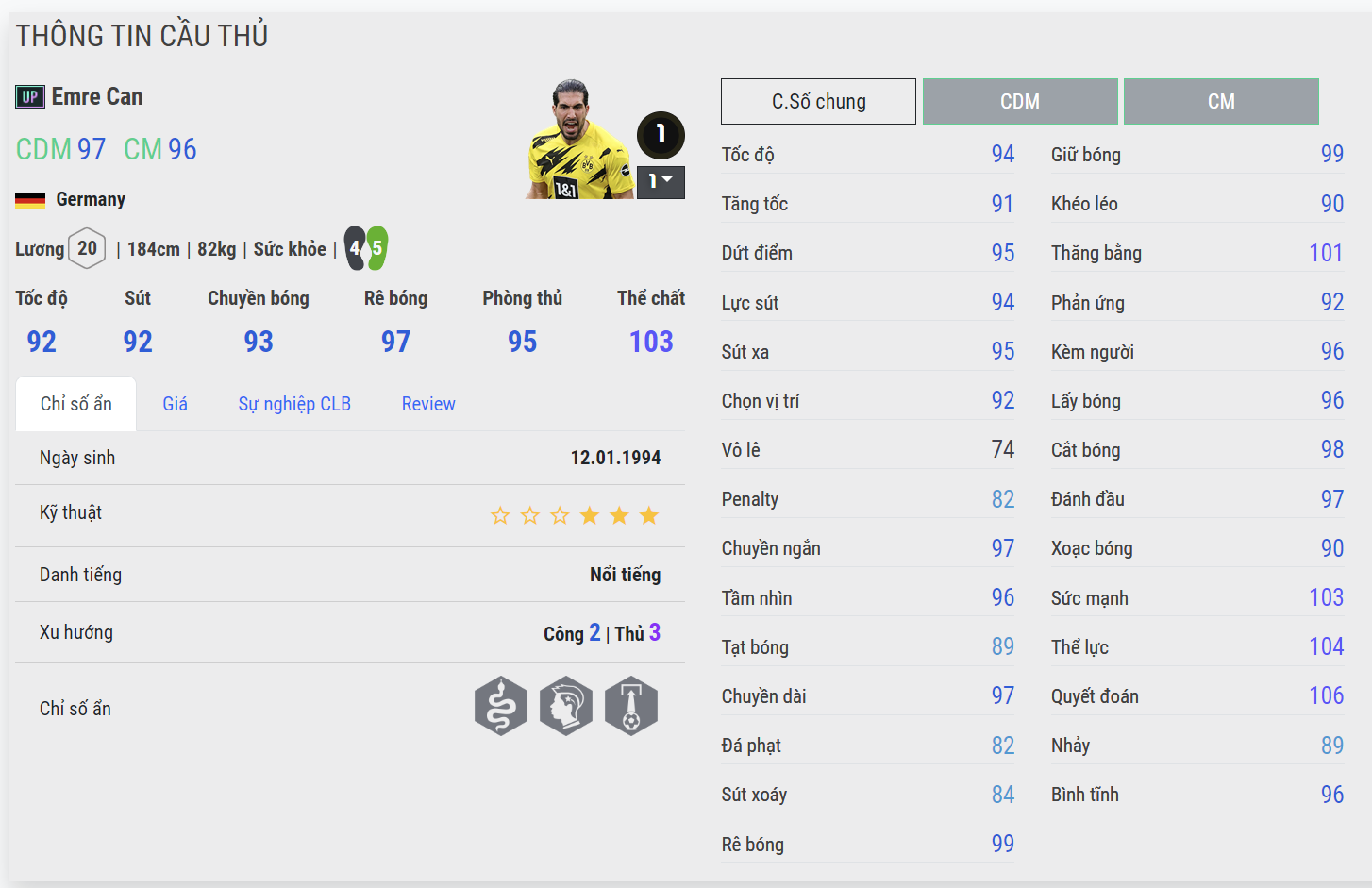 Cầu thủ người Đức là một trong những tiền vệ phòng ngự khá toàn diện và được tin dùng bậc nhất. Đặc biệt với mức thẻ cộng 8, Emre Can cho thấy một sự hiệu quả rõ rệt trong khả năng quán xuyến tuyến giữa không thua kém các tiền vệ quốc dân.