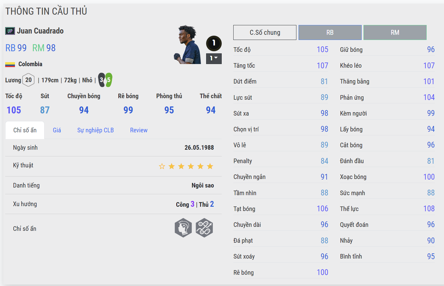 Cầu thủ chạy cánh phải khá toàn diện cả về tấn công lẫn phòng ngự và được lựa chọn rất nhiều để cân lượng cho vị trí cánh trong sơ đồ 3 trung vệ lẫn sơ đồ 4 hậu vệ. Cuadrado có AI di chuyển tốt, lối chơi hiệu quả và vẫn được tin dùng cho tới thời điểm hiện tại ở mức thẻ cộng cao.
