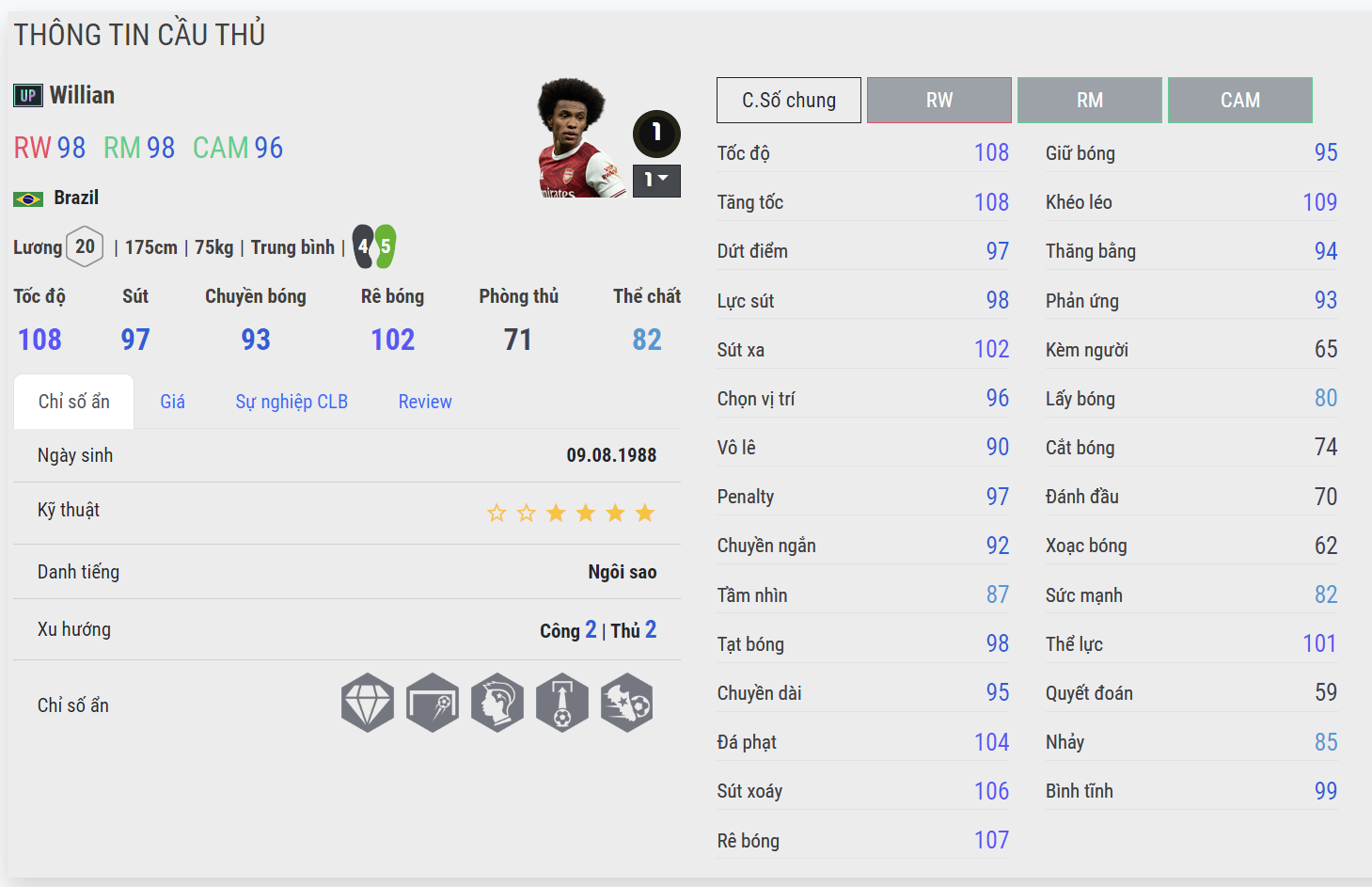 Cựu cầu thủ Chelsea có lẽ là một trong những cầu thủ chạy cánh có độ ảo khá cao dù cả về mặt danh tiếng lẫn chất lượng mức thẻ không thực sự nổi bật. Ở mức thẻ cộng 8, Willian cho thấy rõ sự khó chịu ở hành lang cánh khi vừa có tốc độ tốt, rê dắt dẻo lại còn có khả năng sút cực tốt cả những tình huống sút xa, zd lẫn sút thằng trong vòng cấm.