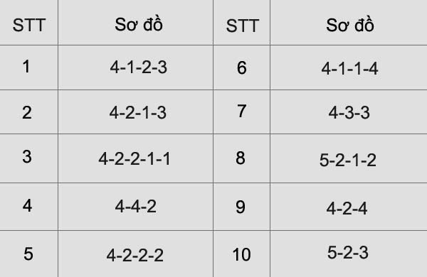 - 4-1-2-1-2 và 4-1-1-1-3 đã tuột khỏi top 10