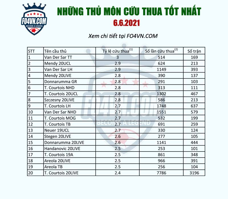 Thủ môn hiện nay dù quanh đi quẩn lại là Van Der Sar hay Courtois. Tuy nhiên tùy thuộc vào việc buff team color mà người chơi sử dụng những cầu thủ gác đền phù hợp. Dưới đây là 20 cái tên cứu thua xuất sắc nhất hiện nay. ( theo tỷ lệ cứu thua trung bình trong một trận )