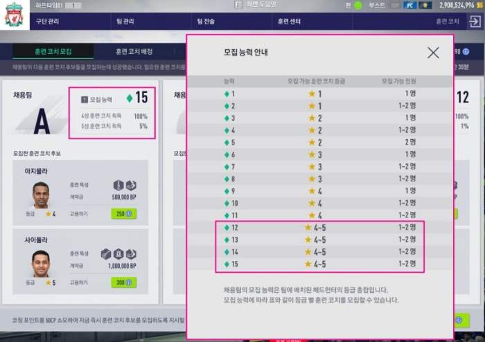 Như trên hình có bạn có thể thấy số 15 hiển thị ở góc trên bên trái là cấp độ tuyển trạch viên. Như vậy muốn có xác xuất tuyển ra HLV 5 sao, bạn cần 3 HLV 4 sao trong một đội tuyển dụng. Xác xuất tuyển ra HLV 5 sao vẫn là may rủi nhé, vì bạn chỉ chắc chắn tuyển ra HLV 4 sao mà thôi.