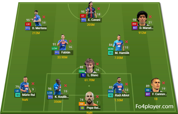 Đội hình lựa chọn cho Napoli là đội hình 4-1-2-3 với bộ 3 tấn công Mertens, Cavani và Maradona. Tuyến tiền vệ trung tâm bao gồm Hamsik, Fabian, Blanc.