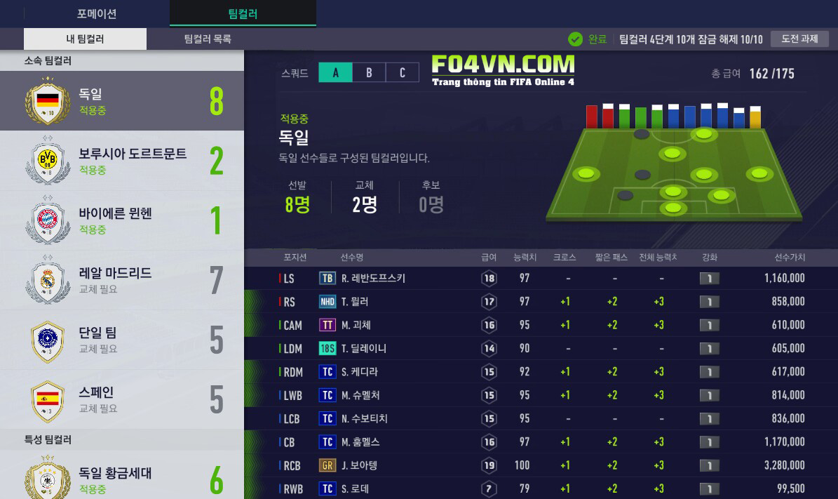 Hình ảnh chỉ số mà team Color Đức được buff. Ngoài ra còn có team color Dortmund và team color Bayern cũng có số lượng cầu thủ khá đông.
