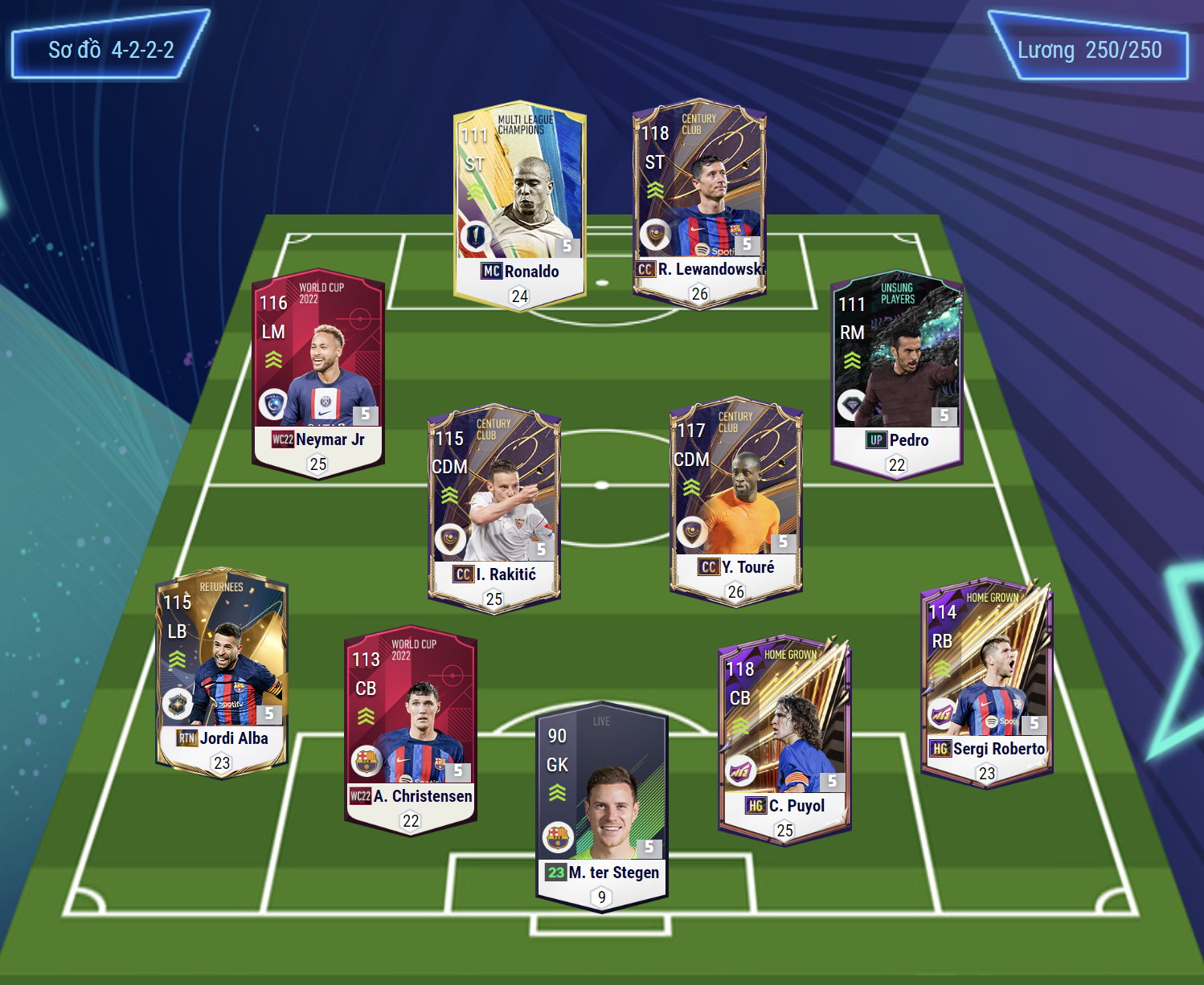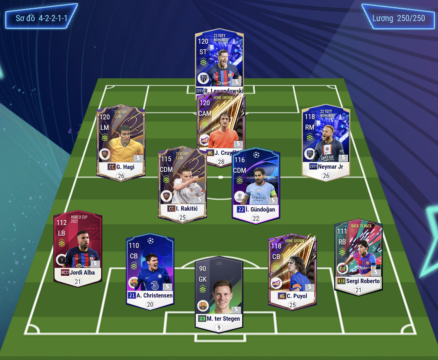 Ở giai đoạn này, nâng cấp một chút cho vị trí tiền đạo cắm hợp với meta cũng như toàn diện hơn đó chính là Lewandowski. Tiền đạo được xem là có hiệu suất ghi bàn rất tốt của FC Online. Ở hành lang cánh nâng cấp từ Overmars lên Neymar sẽ thấy được nhiều sự khác biệt rõ rệt cải thiện tốc độ, khả năng rê dắt và dứt điểm.