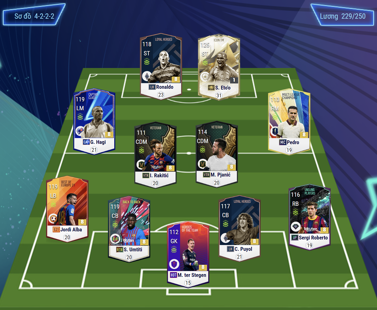 Khi tiềm lực tài chính thực sự mạnh, các HLV cần nghĩ đến việc nâng vàng đội hình của mình bởi ở thời điểm hiện tại, team color +8 được buff chỉ số tốt hơn và cũng cho 1 AI thông minh và nhạy hơn. Hàng công sẽ bao gồm Rô béo LH +8 cặp với top 1 tiền đạo cắm của Barca về hiệu suất ghi bàn ở thời điểm hiện tại : Eto'o ICON TM.